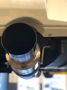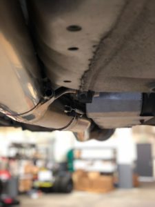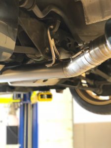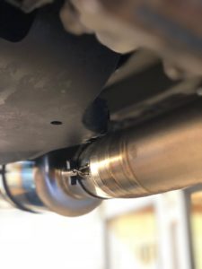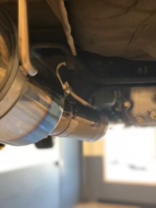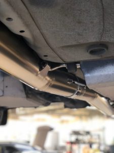 On the other hand, the system installed by the customer had fitment challenges, with the midpipe interfering with the floor pan, the angled pipe section touching the rear crossmember, and the muffler can was misaligned in the bumper outlet. The rotation of the angled pipe and muffler can were off, and the rear diffuser was melted onto the exhaust pipe. The rattling was so intense that the installer had to add rubber shims and baling wire to insulate the exhaust from the components that it touched. With the owner’s permission, the whole system was loosened up and each component was adjusted to fit properly, eliminating ALL of the fitment issues and rattling noises that were present before.